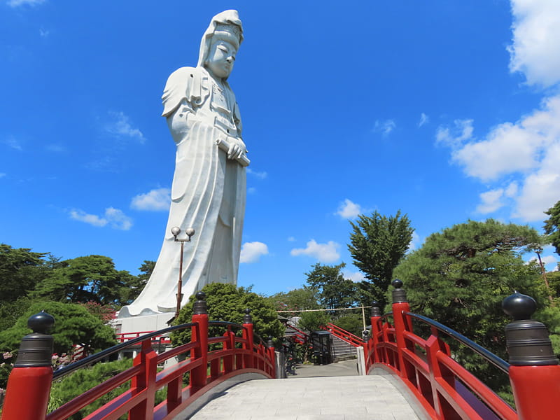 高崎市のシンボルとして親しまれる白衣大観音は、1936年に建立された高さ約41.8mの巨大観音像です。 観音山の丘に立つその優美な姿は、市内各所から望むことができ、訪れる人々を静かに迎えます。 観音像の内部には階段が設けられており、上階の窓からは高崎市街や群馬の山並みを一望することができます。 周辺には公園や散策路も整備され、四季折々の自然とともにゆったりとした時間を過ごせるのも魅力です。